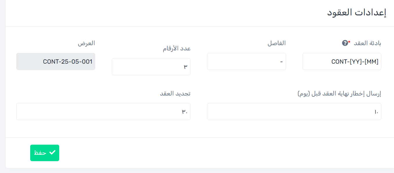 يمكنك ضبط بادئة وترقيم العقود من خلال اتباع الخطوات التالية: