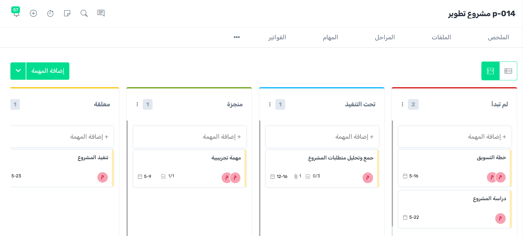 يمكنك عرض لوحة كانبان الخاصة بمشروع محدد خلال الضغط على زر الاجراء بجانب اسم المشروع من جدول المشاريع والنقر على تبويب عرض لوحة كانبان العام.