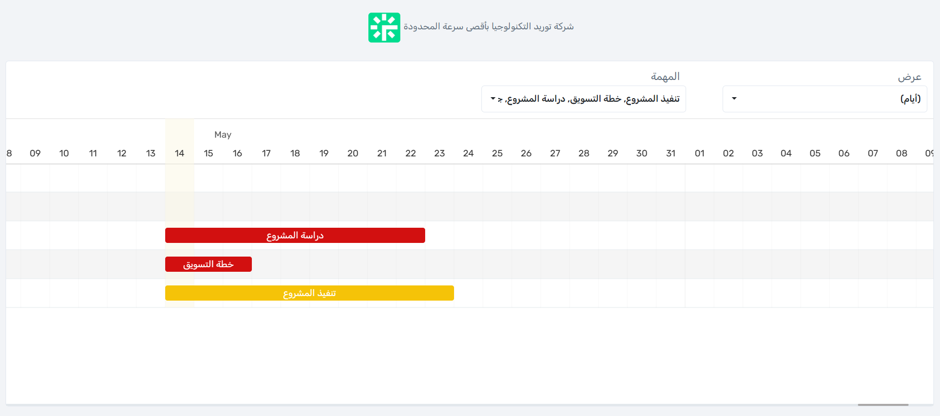 يمكنك استعراض مخطط جانت في رابط خارجي يمكن مشاركته أو استعراضه في الاجتماعات دون الحاجة إلى الدخول إلى النظام ، يتم ذلك عبر اختيار عرض مخطط جانت من قائمة اجراءات المشروع.