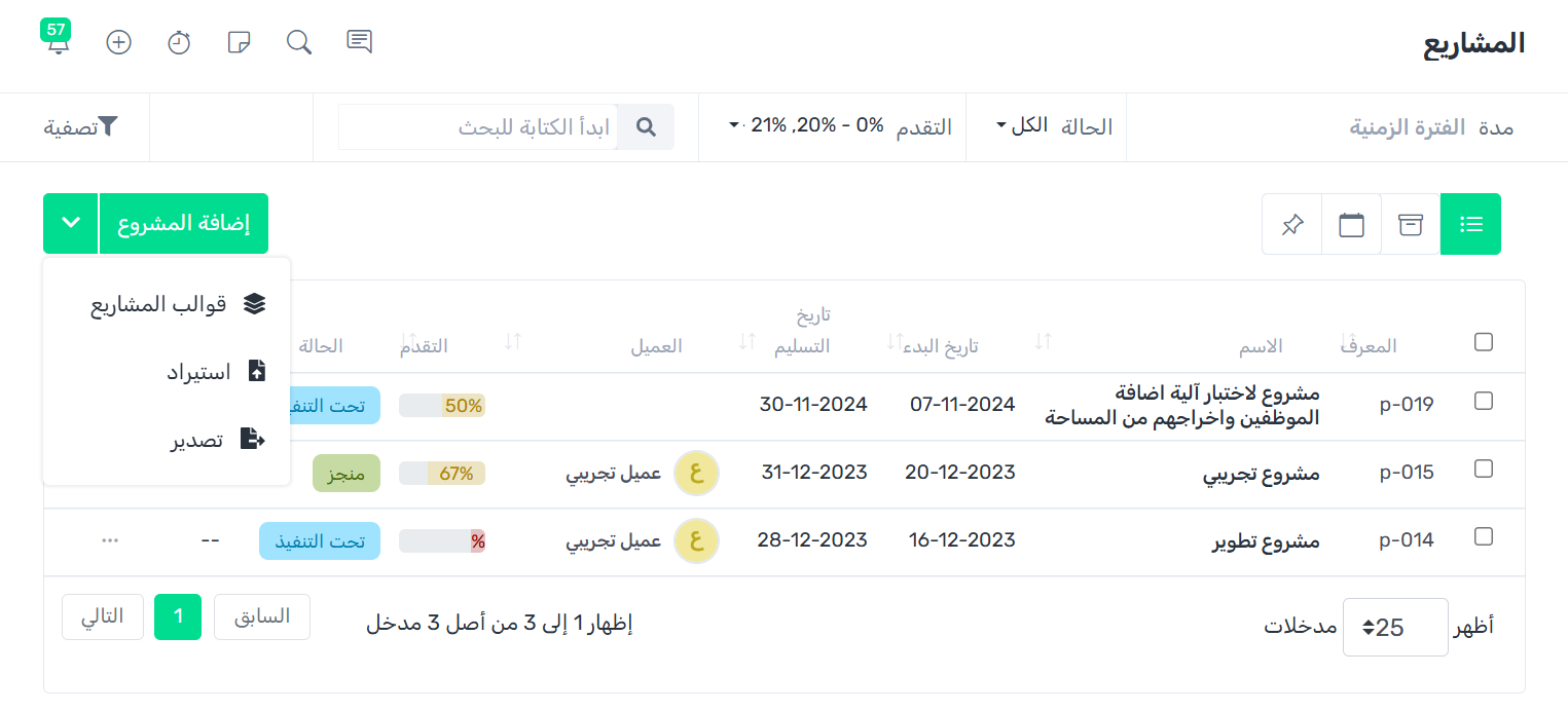 يمكنك اضافة مشروع جديد بقالب محدد عبر الضغط على زر اضافة مشروع من قائمة اجراءات القالب المحدد.