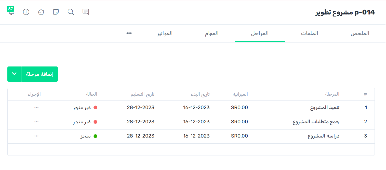 يمكنك إضافة مراحل لمشروع عبر الخطوات التالية: