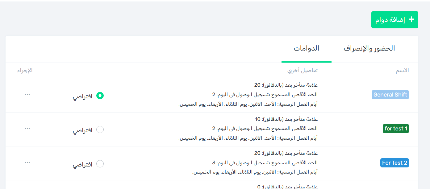 في حال تحديد جدول دوام على أنه افتراضي فسيكون هو جدول دوام الموظف عند إضافته ما لم يتم تحديد جدول آخر للموظف.