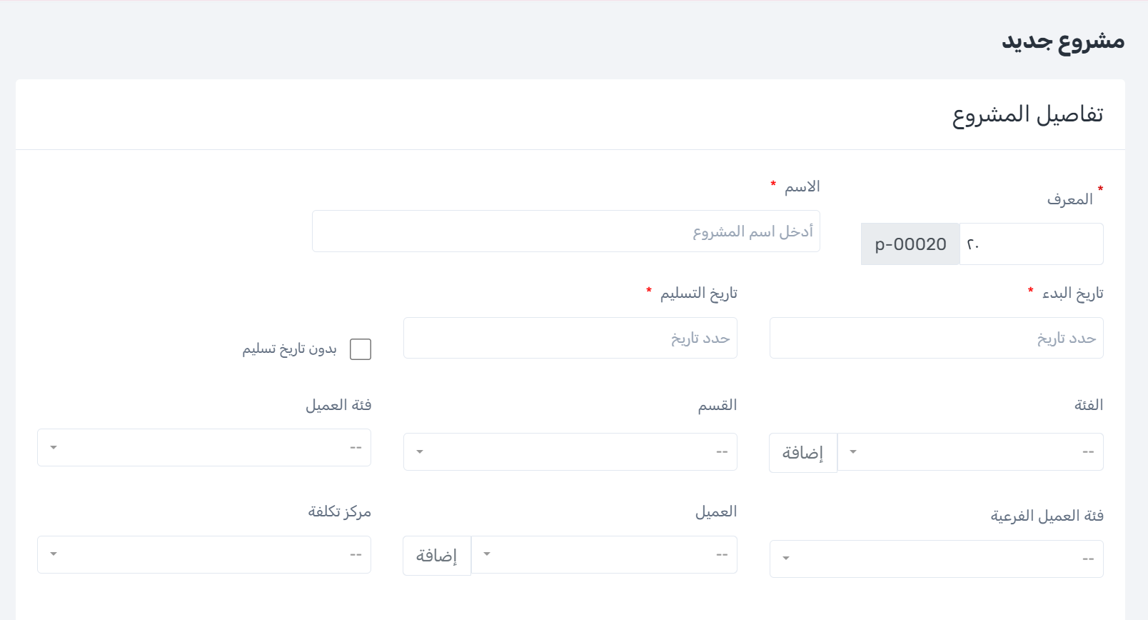 قم بتعبئة البيانات الأساسية للمشروع واسم العميل الخاص لهذا المشروع