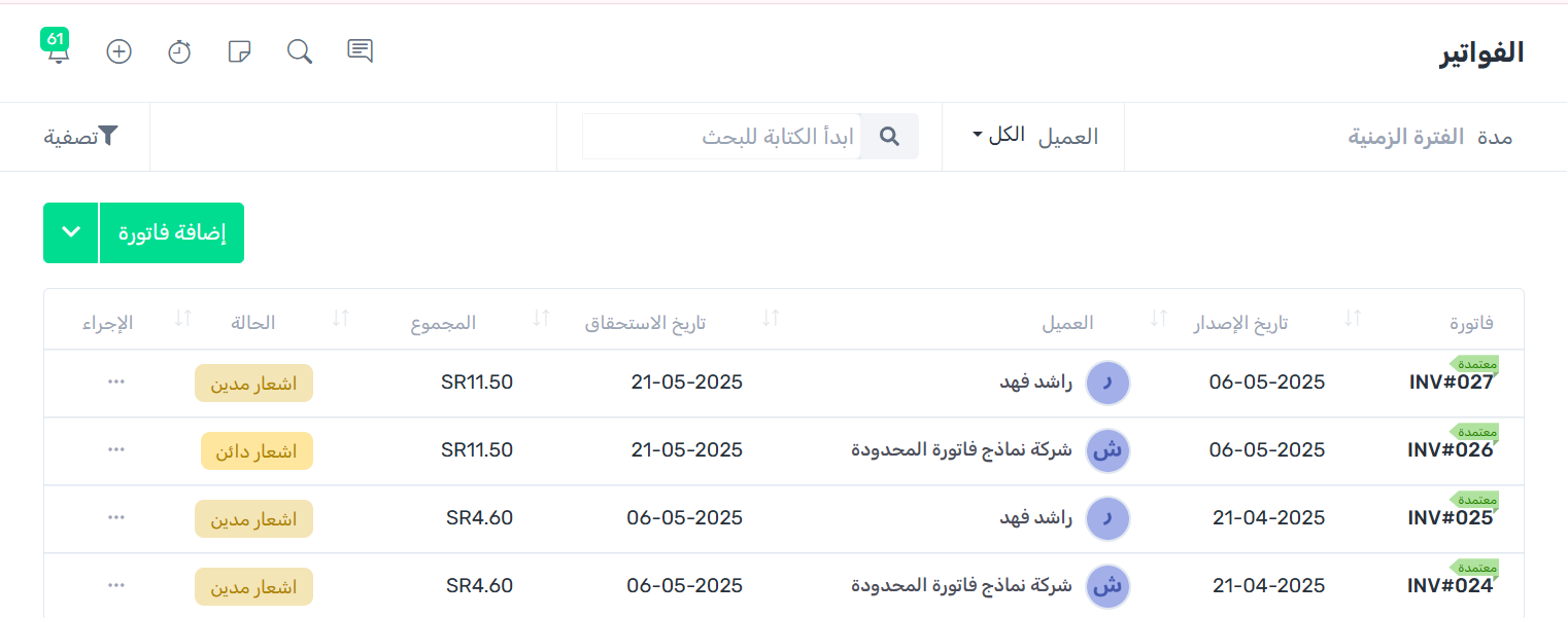 بعد الانتهاء انقر على زر حفظ لإضافة الفاتورة.