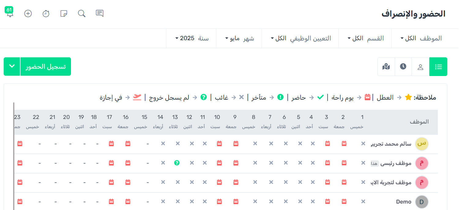 لضمان تسجيل الحضور اليومي بشكل صحيح، يُرجى مراجعة إعدادات الحضور في النظام اولاً