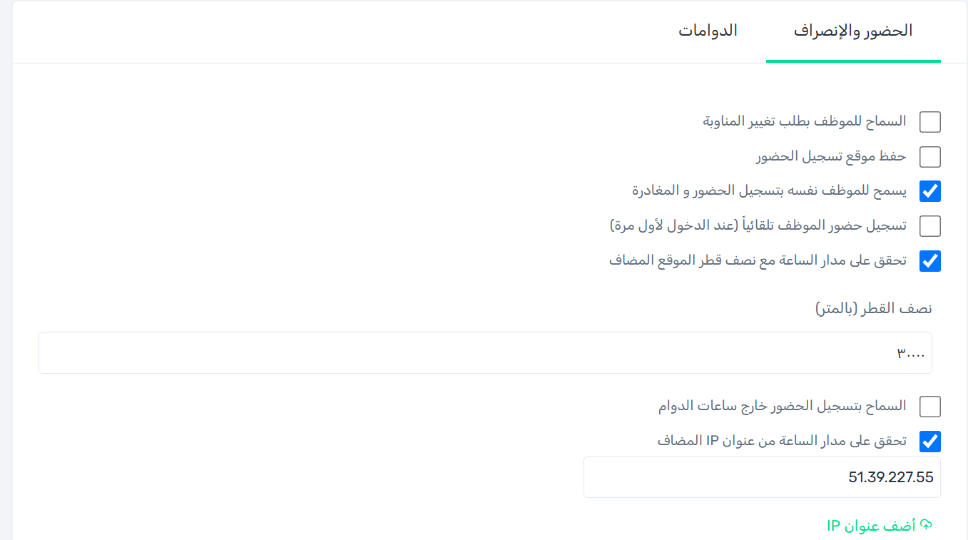 يمكنك تقييد الموظف بتسجيل الحضور والانصراف بمكان محدد باتباع الخطوات التالية:
