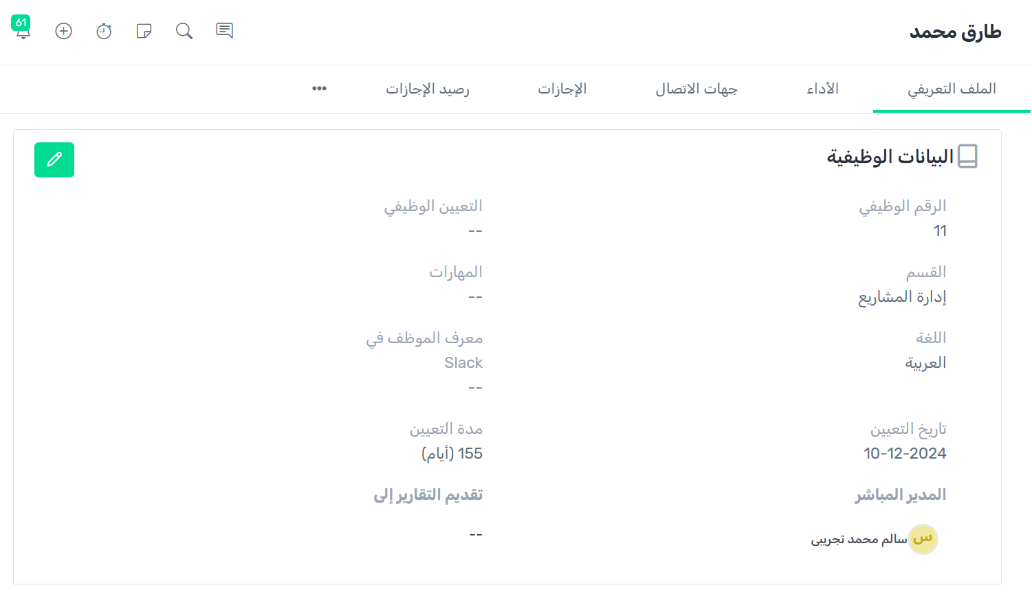 يمكنك إضافة البيانات الوظيفية للموظف باتباع الخطوات التالية: