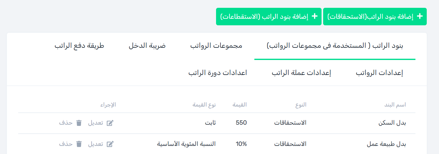 انقر على إضافة بنود الراتب(الاستحقاقات) أو إضافة بنود الراتب(الاستقطاعات).